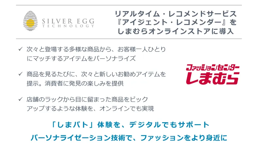 シルバーエッグ・テクノロジー株式会社(本社:大阪府吹田市、代表取締役社長&CEO:トーマス・フォーリー、東証マザーズ:3961、以下 シルバーエッグ社)は、同社が開発・提供するAI技術を用いたレコメンドサービス「アイジェント・レコメンダー」を、株式会社しまむら(本社:埼玉県さいたま市、代表取締役社長:鈴木 誠、以下 しまむら)のオンラインストア( https://www.shop-shimamura.com/ )に導入しました。