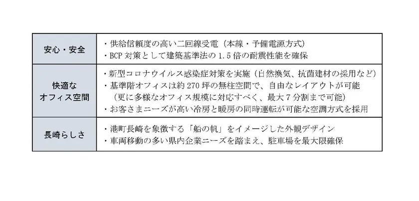 本計画は、安心・安全、快適性及び長崎らしさを兼ね備えた建物として、長崎県内企業、更には県外企業の誘致も目指し、長崎市の発展に寄与します。
