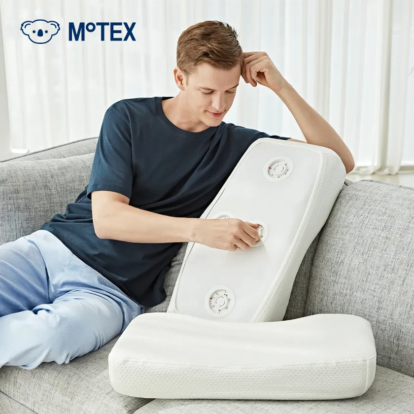 1. 枕裏面にある4つのダイヤルで頭、首、両肩の枕の高さが調節可能