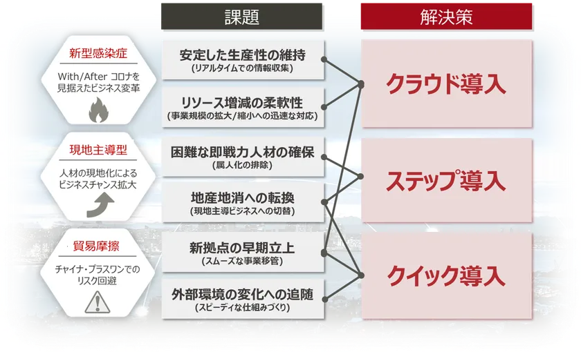 海外拠点では、新型ウイルスや貿易摩擦等のリスクを考慮し、事業拡大・縮小や移転・撤退など、外的な変化に合わせた事業見直しや意思決定を迅速かつ柔軟に進める必要があります。また、海外事業の継続、拡大に向けて、本社補完型から現地主導型へのビジネス転換が必要とされています。