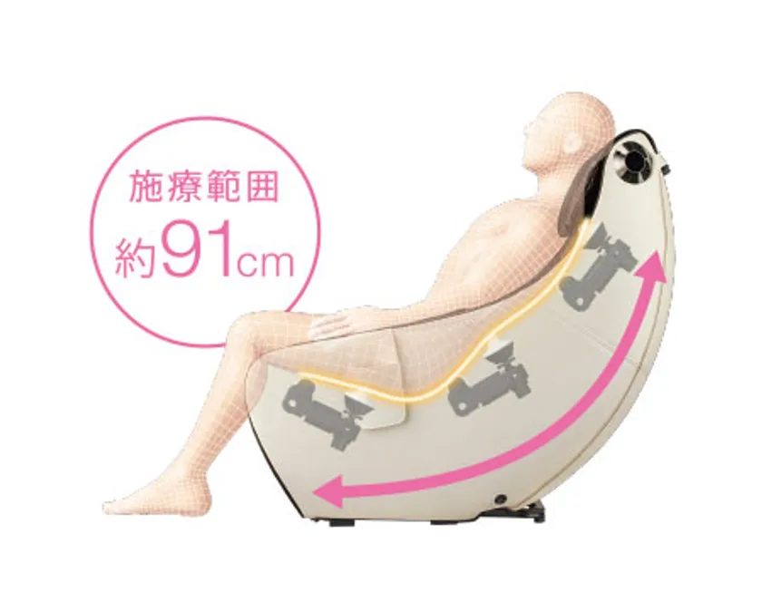 L字型のフレームを採用することで、施療範囲約91cmを実現した「ロングストロークマッサージ」で、背中からもも裏まで広範囲にもみほぐします。動作範囲は「全身」、「上半身」、「下半身」から選択できます。