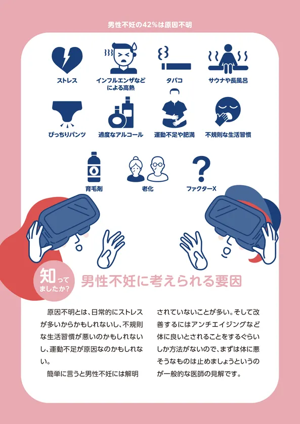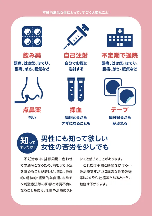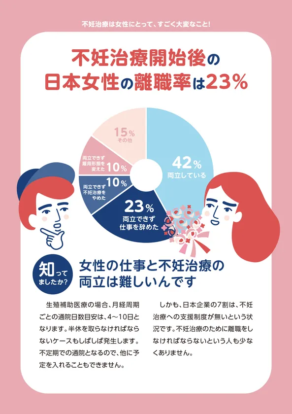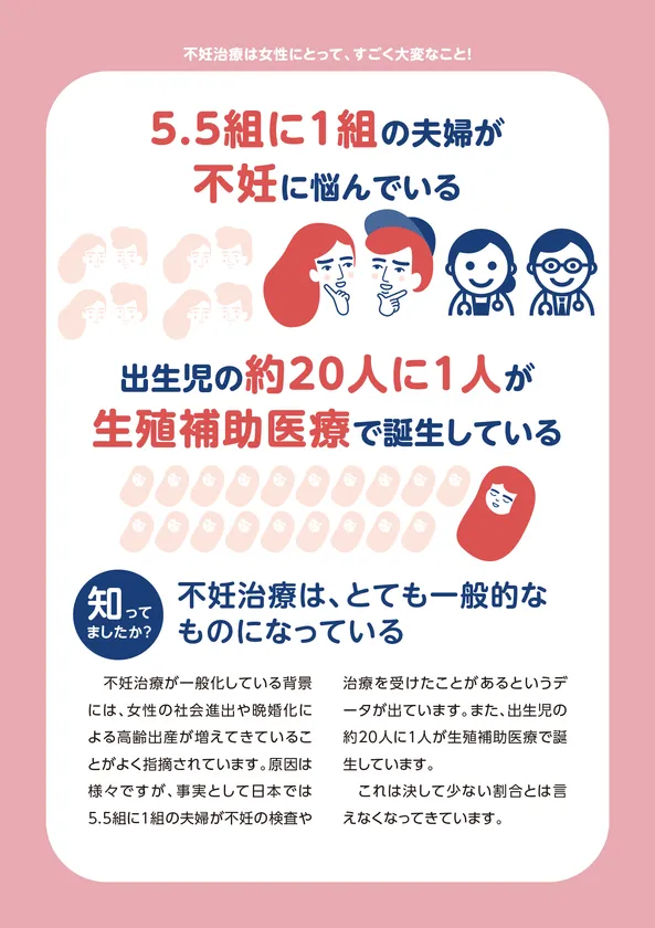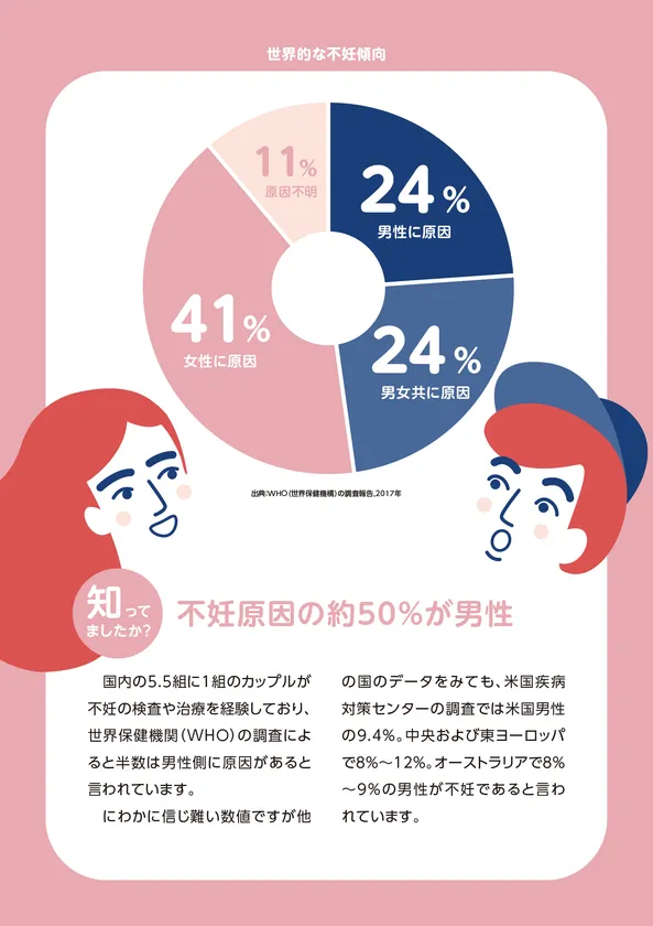 不妊の原因は女性だけではありません。不妊の半分は男性が原因です。そして3組に1組の夫婦が不妊を心配し、3人に1人の女性が仕事と不妊治療を両立できずにいます。