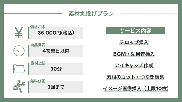 ■キャンペーン対象 ・カット済みプラン 25,000円→12,500円(税込) ・素材丸投げプラン 36,000円→18,000円(税込)