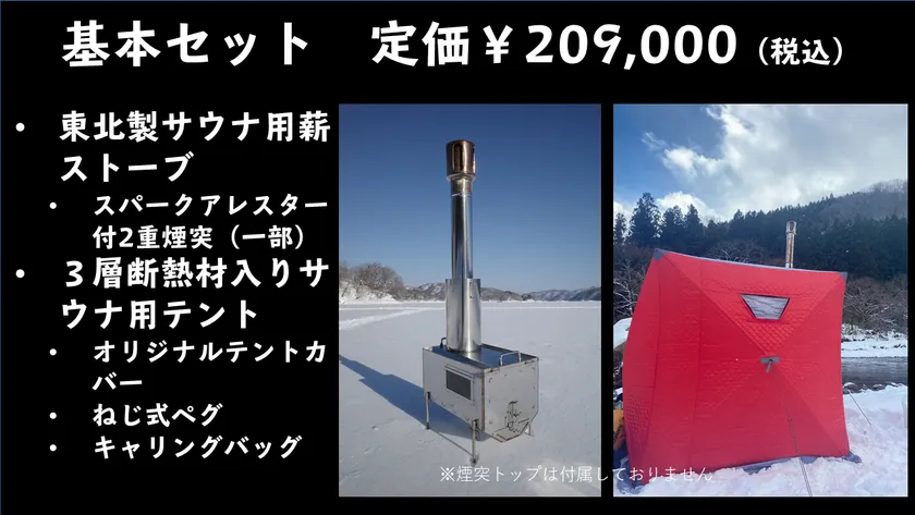 ※実際にアウトドアサウナを楽しむためには、上記の他に、一酸化炭素チェッカー、耐熱グローブ、火箸などの装備品が必要です。