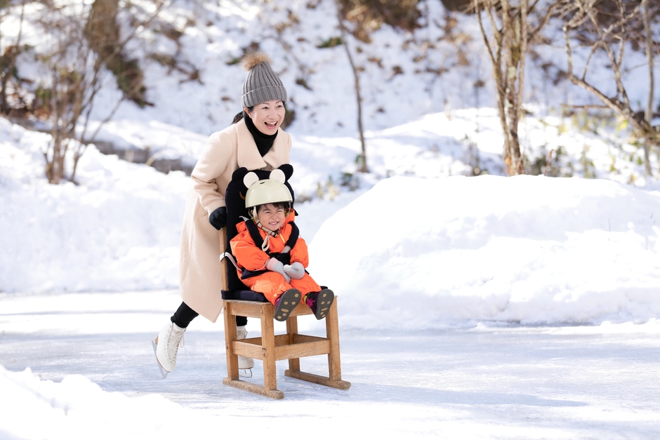 「スケート靴は履けないけれど、スケートの雰囲気を体験させたい」というご家族の声にお応えし、小さなお子様専用シートを載せたソリ付き椅子を開発しました。車のチャイルドシートと同じように、お子様の両肩と腰をベルトで固定できます。ソリ付き椅子を大人が押しながら滑ることで、小さなお子様も氷上を滑走するスピードを体感できます。森に暮らすツキノワグマをデザインし、楽しく体験できる工夫をしました。