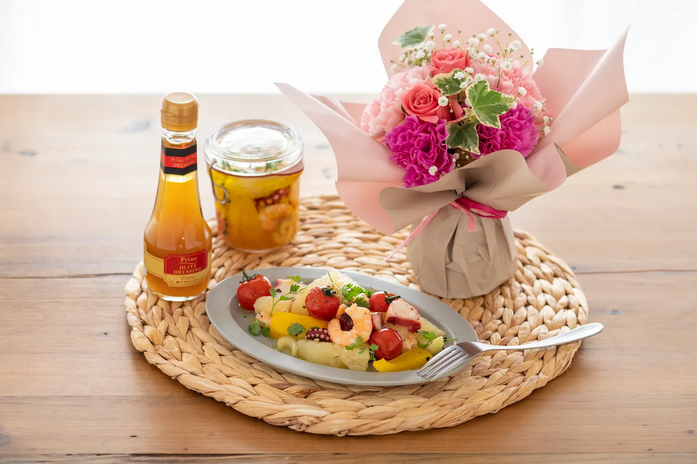 母の日のおうち時間をもっと素敵に。お母さんへ美味しい!ヘルシー!な贈り物を。スペイン アンダルシア州産のオリーブのみを使用し、バランスのとれたフルーティな味わいが特徴の「ギフト限定エキストラバージンオリーブオイル」、瀬戸内産のかんきつ4種の果汁を使用し、爽やかな味わいが特徴の「プライムオリーブドレッシング・瀬戸内かんきつ」、お料理レシピも一緒にお付けして、素敵なおうち時間を楽しめる贈り物になっています。いつも忙しいお母さんへ、簡単・手軽に美味しいお料理が楽しめるオイルギフトセットに、母の日にピッタリなそのまま飾れるブーケを添えてお届けします。バラとカーネーションのパープルからピンクのトーンでまとめたブーケは、お母さんの柔らかく可愛いらしいイメージを表して。軽やかなカスミソウの花言葉、「感謝」と「清らかな心」に気持ちを込めて贈ります。