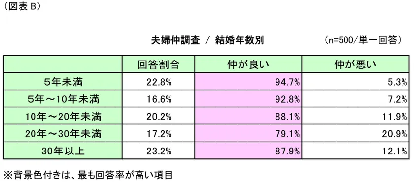 今回ほとんどの夫婦は仲が良いとの結果となりましたが、結婚年数を重ねると徐々に仲の良さが薄れる傾向もみられていることから、これからも互いを気遣って良いコミュニケーションを取り、長く夫婦仲の良さを維持してもらいたいものです。