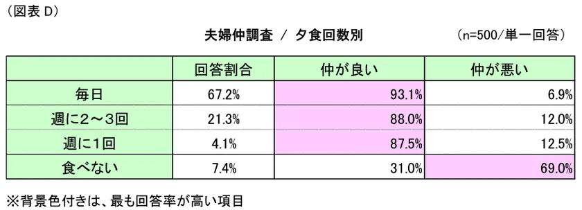 1週間のうち夫婦が一緒に夕食を食べる回数別の調査では、週1回以上一緒に夕食を取る夫婦(回答率87.5%)と、全く一緒に夕食を取らない夫婦(同31.0%)で夫婦仲に大きな差がみられました。