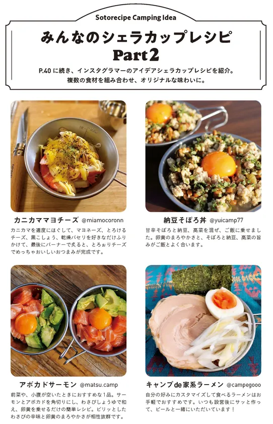おつまみやしっかりした食事、デザートなどキャンプが楽しくなる料理がいっぱい。人気のソロキャンプやグランピングはもちろん、自宅でも楽しめるレシピも多数!手軽でおいしいシェラカップレシピを思いっきり堪能しましょう!