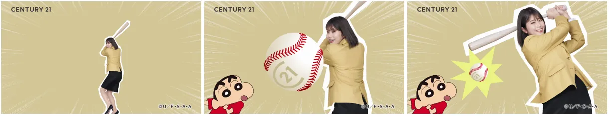 センチュリー21 新CM。 稲村亜美、クレヨンしんちゃんがケイン・コスギとともに 新イメージキャラクター就任! 稲村亜美、豪快フォームで華麗なバッティング披露。