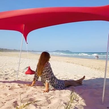 特殊素材は危険な日差しから、SPF50+で肌を保護することができます。超軽量でおよそ1,900g!コンパクトに持ち運べ、簡単に組み立てられるよう設計されています。高品質の4方向に伸びるストレッチ生地は、日差しの向きに関わらず自在に角度がつけられます。ペグを使わず砂袋で固定するので安全かつ安定した設置ができ、耐風性に優れています。