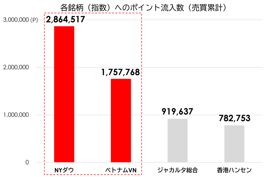 キャンペーン期間中の各銘柄(指数)へのポイント流入数(売買累計)と取引回数