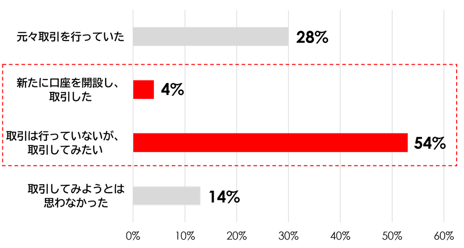 「取引をしてみたい」が54%、「新たに口座を開設し取引した」は4%