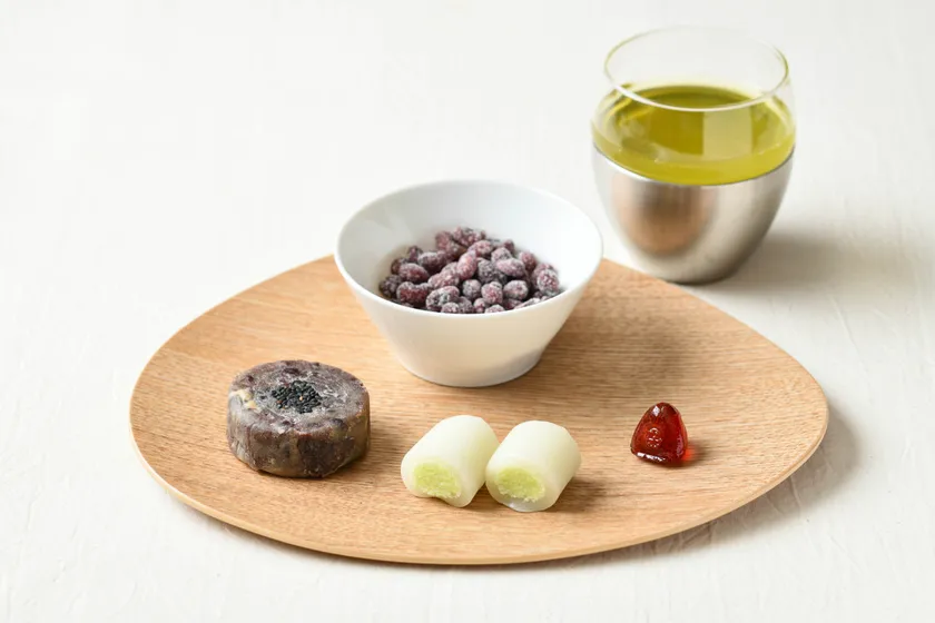 数ある菓子のうち、初代栄太郎の個性豊かな創製菓として今も販売を続けている「名代金鍔」「甘名納糖」「玉だれ」「梅ぼ志飴」。これらすべてをワンプレートに少しずつ楽しめる特別セットを2週間限定でお召しあがりいただけます。
