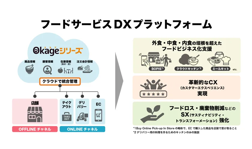 オンラインチャネル強化のニーズは今後のアフターコロナでも加速すると考えております。当社はOkageシリーズを「フードサービスDXプラットフォーム」と位置付けて、オフラインチャネルの店舗とテイクアウト・デリバリー・ECといったオンラインチャネルにおける商品情報、顧客情報、在庫情報、注文会計情報を統合管理し、外食・中食・内食の垣根を超えたフードビジネス化支援、革新的なCX実現、フードロス・廃棄物削減などのSX強化を支援してまいります。