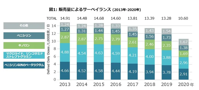 薬剤疫学室では、日本の抗菌薬使用量を集計する仕組みを整備してきました。薬剤耐性(AMR)対策アクションプランができた2016年は、販売量による抗菌薬使用量サーベイランスが研究として行われているのみでした。しかし、現在は当室がそれを事業として引き継ぎ、年1回、継続的なサーベイランスを実施しています。販売量サーベイランスは3-4月には前年のデータが公開可能であるため、年次抗菌薬使用量の速報値として利用しています(図1)。
