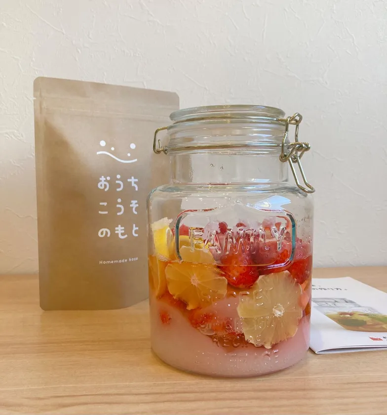 こちらの商品はお好きなフルーツを米麹菌や食物酵素などが入った「おうちこうそのもと」と混ぜ、毎日1回混ぜることで発酵が始まり、10日~20日程で酵素エキスが出来上がるという商品です。発酵する際に使うお洒落な瓶と酵素エキスの作り方やレシピなどが入った冊子もキットとして含まれています。日に日に変わる風味も楽しめ、フルーツを変えることで色々な味が楽しむことができ、ファスティングの栄養補給や菌活に興味のある女性に人気となっています。