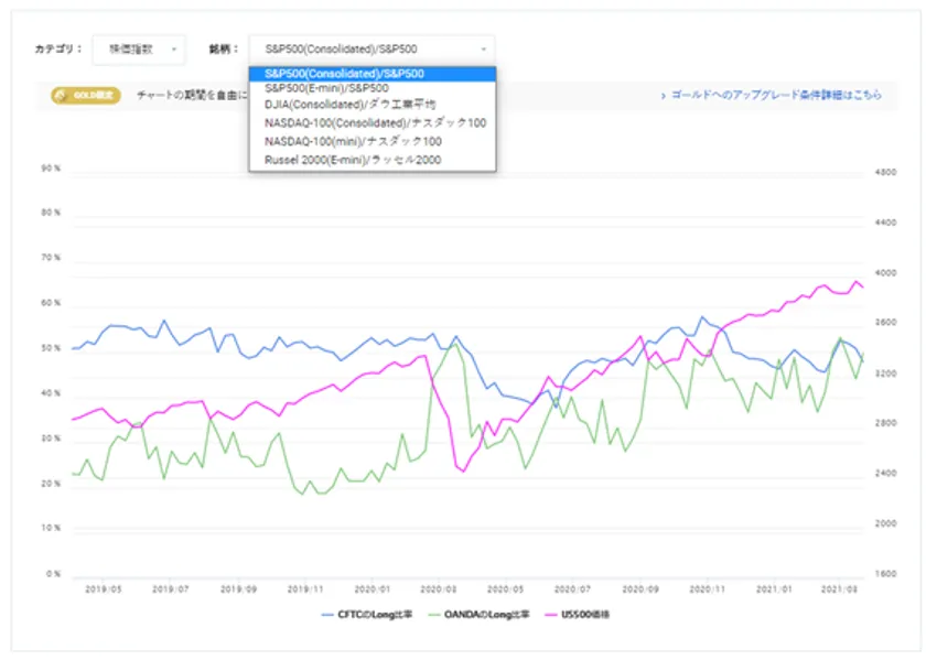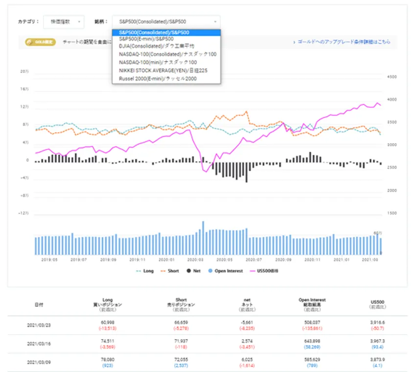 ポイント(1):株価指数、貴金属、エネルギーなど多種多様な資産の投機筋ポジションを確認できます。