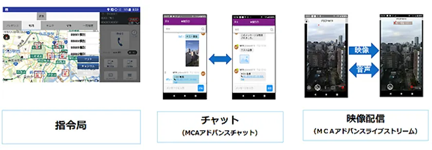 アプリケーションは被災状況を的確・迅速に伝達するための文字、画像、クリップ動画が送れるチャットアプリ(MCAアドバンスチャット)、リアルタイムでの映像配信アプリ(MCAアドバンスライブストリーム)を初期ラインナップとして提供すると共に、ミッションクリティカルな業務を担う企業・団体のニーズに合わせた更なるメニューの拡充を計画しております。