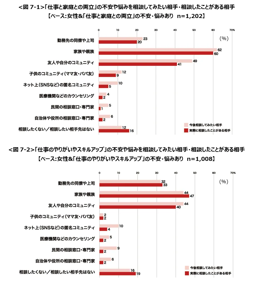 仕事に関する不安や悩みを相談できる相手は身近にいる「家族や友人」が大半を占める。一方で、カウセリングや専門家のアドバイス、ネット上の匿名コミュニティを実際に利用したことがある人は全体の数%程度しか存在しないが、これらを今後利用したいと思う人は1割程度存在し、潜在的な期待・ニーズがうかがえる。