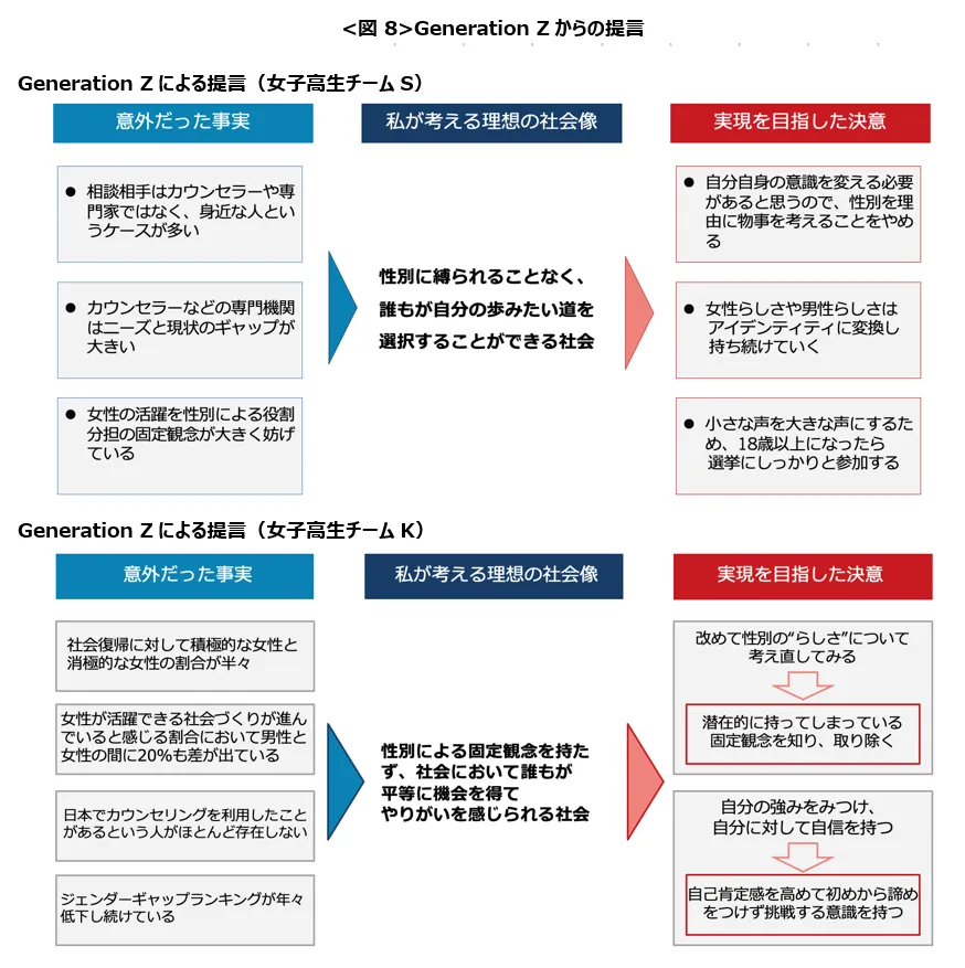 今回実施した調査の結果を踏まえ、GenerationZ世代(高校生)からは以下のような提言がなされた。理想的な社会像の実現に向け、自身として意識・行動することへの決意がうかがえる内容である一方で、カウンセリングのようなプロの助言を受ける機会が限られていることが意外であったとの指摘が両チームで共通している。未来を担う世代の活躍をサポートする機能が求められていることがわかる。