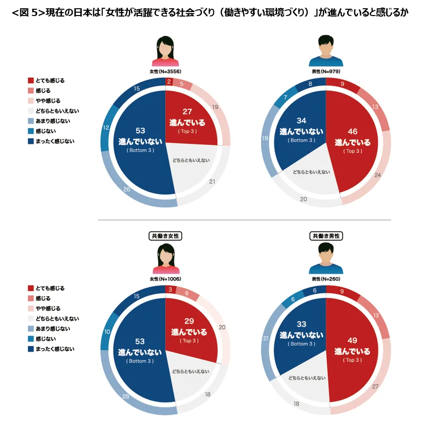 「女性が活躍できる社会づくり(働きやすい環境づくり)」が進んでいるという実感は女性で3割未満、男性でも5割未満と全体的に低く、性別差も見られる。共働き世帯の回答に限定しても同様の結果となり、「社会におけるジェンダーギャップ」が未だ解消されていないことが確認された。