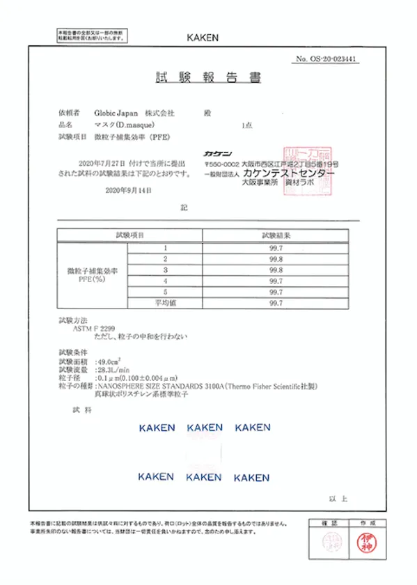 「D.masque(ディーマスク)」のフィルターは一般財団法人カケンテストセンターで検査をしており、0.1μmの微粒子を99%ガードするという結果が出ております。