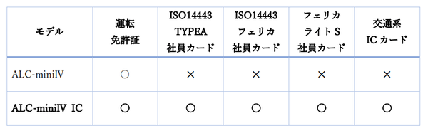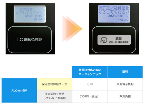 従来モデルの ALC-miniⅣを使用中のユーザ様は、そのままIC運転免許証機能をお使いいただけます。IC社員証や交通系ICカードに対応させたい場合は、有償でバージョンアップを申し受けます。