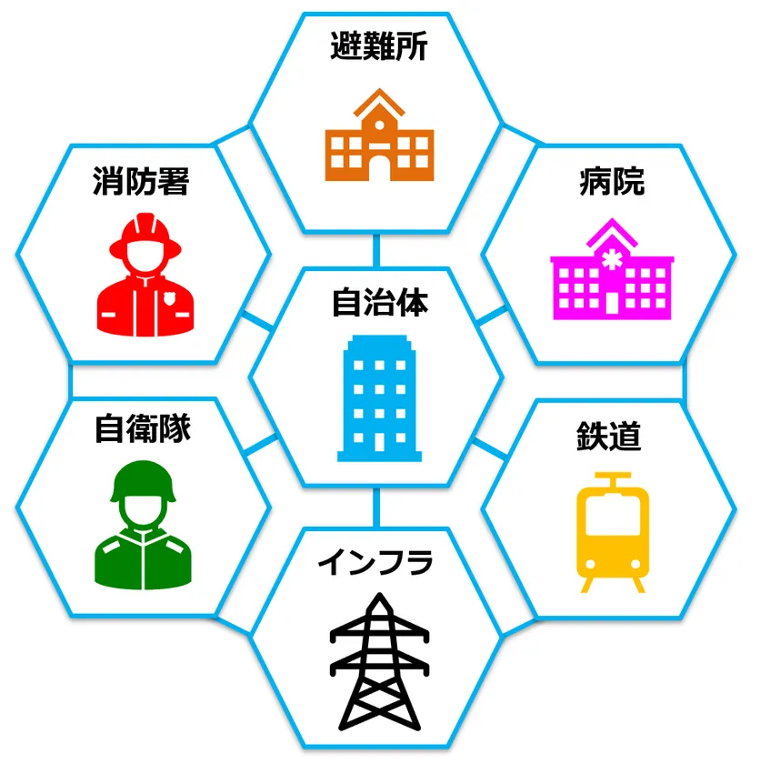 大規模災害時は災害対策本部、区災害対策本部、指定避難所、災害拠点病院、鉄道、通信事業者、陸上自衛隊、電気・ガス・水道事業者、消防署など組織をまたいだ迅速な情報連絡が必要となります。業務用IP無線システムiMESHはパケット通信網を利用したシステムとなっており、広範囲にわたる様々な組織とも一斉に情報連絡を行うことが出来ます。