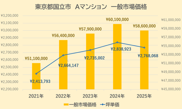 Aマンションの一般市場価格・坪単価の推移は上記【図3】の通りです。