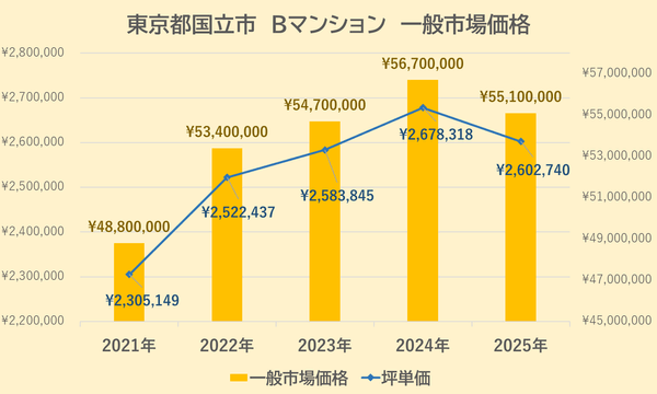 Bマンションの一般市場価格・坪単価の推移は上記【図4】の通りです。
