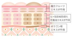 ヒト幹細胞培養液は既存のシミに、オウゴン根エキスはこれからできてしまうシミにアプローチします。複合フルーツエキスが肌を柔らかくすることにより、先の2つの成分の浸透・効果を一層高めます。
