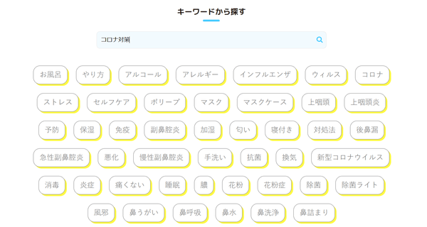 コロナ対策に関する記事や花粉、アレルギー、上咽頭炎や後鼻漏と幅広いキーワードから、鼻にまつわる記事を探すことができます。