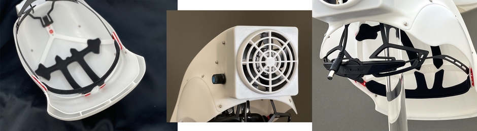 ⾦医師によるコンセプトは、「ヘッドギアタイプのパーソナルエアシールド」。施術や作業時、従事者の顔に⾶散する可能性のあるエアロゾル(⾶沫)を、電動ファンを仕込んだヘルメット状デバイスにより、額上部から強制的な送⾵によって防護する、というものです。