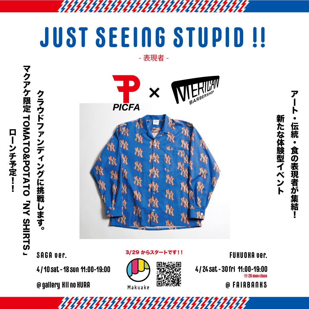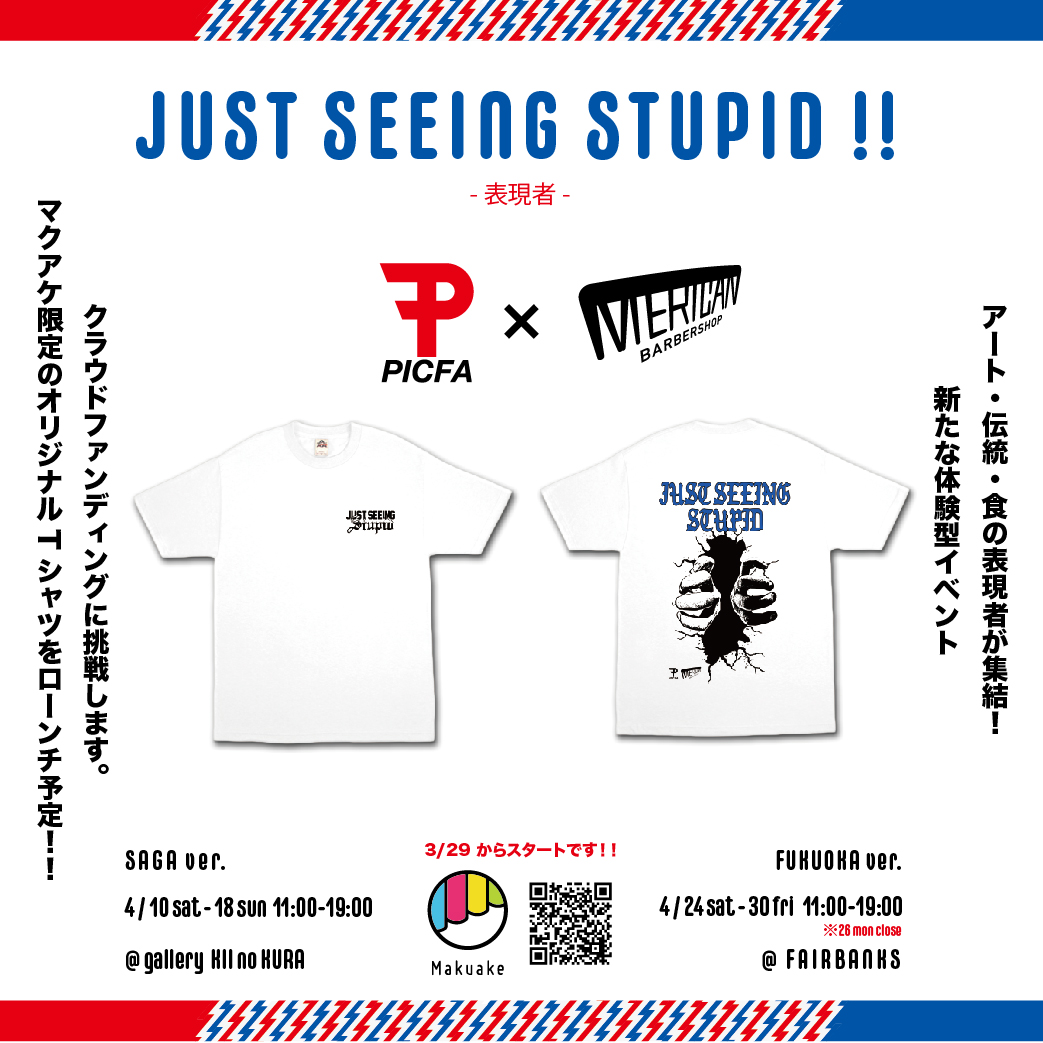 この度、医療法人清明会障害福祉サービス事業所 PICFA(福祉施設、所在地:佐賀県、代表:原田)及びMERICAN BARBERSHOP(理髪店、所在地:福岡県、代表:網谷)は、アート・伝統・食の表現者が集結する新たな体験型アートイベント、『JUST SEEING STUPID!! -表現者-』の開催資金の運用及びPRを目的に2021年3月29日にクラウドファンディングを開始しました。