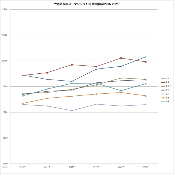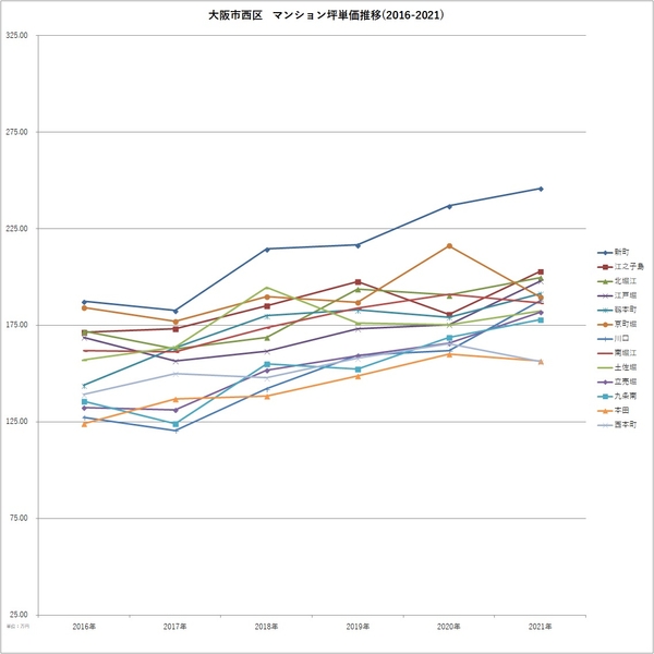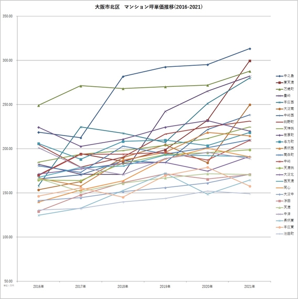 「不動産×WEB×ビッグデータ」の領域で、さまざまな不動産テックサービスを展開する株式会社ワンノブアカインド(本社:東京都港区、代表取締役社長:川島 直也、以下当社)は、当社が運営するマンション情報サイト「マンションレビュー」の保有データを元に、「大阪都心6区(福島区・西区・天王寺区・浪速区・北区・中央区」の各町名における、中古マンション相場および2016年からの相場推移について調査。最新の中古マンション価格*1とあわせて、2016年の坪単価と比較した騰落率のランキングを発表いたします。