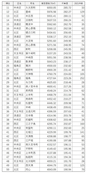 ・1位は「北区大深町」の1億3,513万200円。JR大阪駅(梅田)北側の再開発エリア「うめきた」内の町名で「グランフロント大阪オーナーズタワー」があり、推定価格が唯一1億円を超えた。