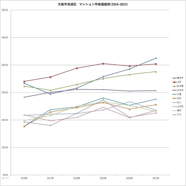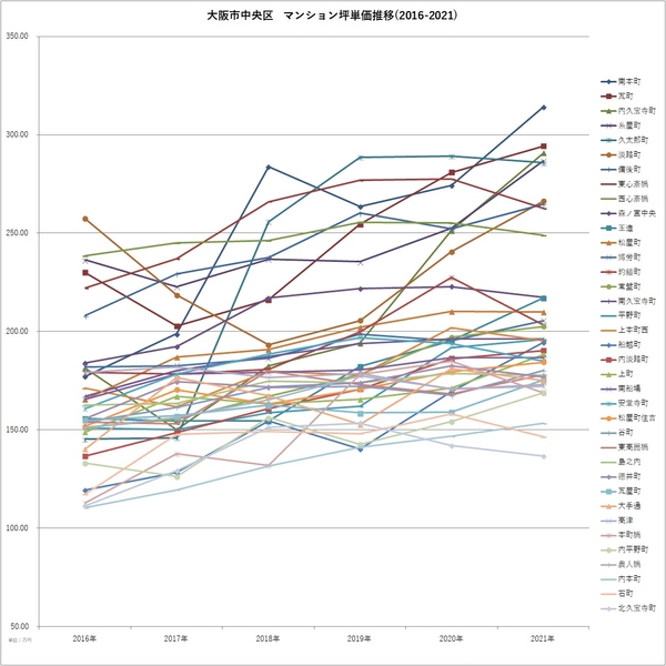 ■各区での町名別マンション坪単価 2016-2021推移
