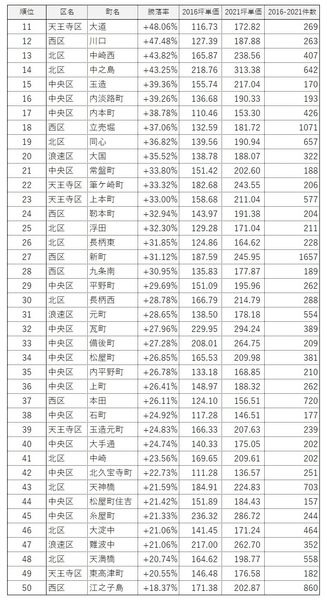 ・1位は「中央区久太郎町」の+96.73%。2016年と比較して、坪単価が約2倍弱まで上昇した。