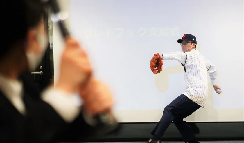クレドブック支給式は「支給」と「始球」を掛けて、野球のユニフォームを着用した社長の投球から始まります。バッターを務めるのは、2021年の新入社員4名。