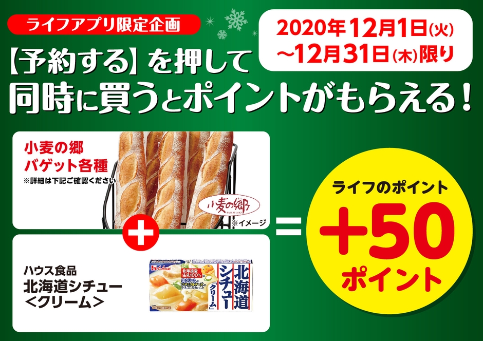 ライフアプリのクーポン画面からポイント予約をした上で、バゲットと対象商品を同時購入すると後日50ポイントが付与されます。