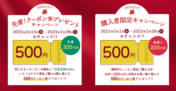 いちごカテゴリ商品購入で次回のお買い物で使える500円クーポンが当たるキャンペーン