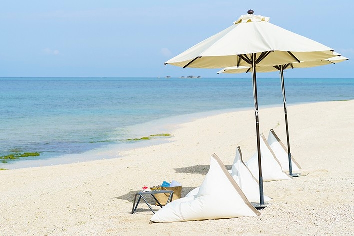 星のや沖縄から車で3分の場所にあるニライビーチは、海水の透明度の高さが特徴の天然ビーチです。クラゲ防護ネットや監視スタッフが配置されており、安全に海水浴を楽しめます。ニライビーチが海開きを迎える4月10日より、星のや沖縄の宿泊者専用のビーチチェアとパラソルの貸し出しを開始します。星のや沖縄からニライビーチまでは定期的に無料の送迎車を用意しており、移動にも困りません。