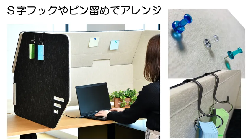 作業スペースにゆとりを持たせ、S字フックやピン留めによる自分好みのアレンジが可能となっています。