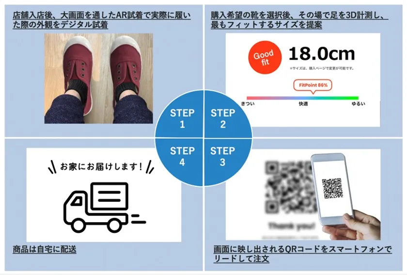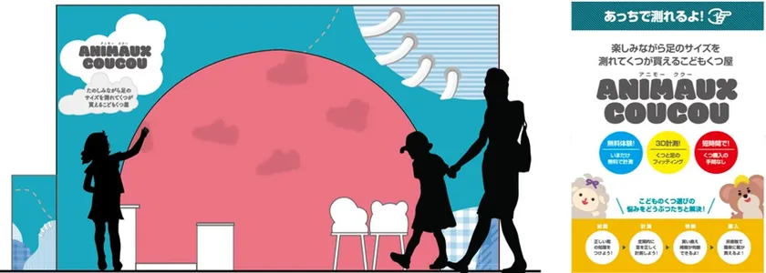 フリックフィットが今回提供する非接触、無在庫販売店舗「最小店舗」は、これまで大きなバックヤードが必要、且つ試着が手間だった靴購買体験に変革を与えます。ECが抱える、靴を履いた際のスタイルや変化する靴のサイズといった実際に試着できないことで生じる“買いづらさ”がない、ユーザー・ブランド双方にとってWIN-WINとなる新たな靴の販売形態(第3の販売形態)として出店します。また今回「川崎ルフロン」では、子供の足の成長に合わせた靴店舗「ANIMAUX COUCOU -アニモー ククー-」の提供を行います。