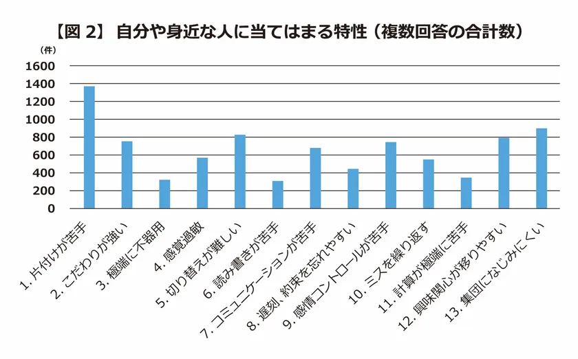 その結果、「1.片付けが苦手」「13.集団になじみにくい」「7.コミュニケーションが苦手」「2.こだわりが強い」「9.感情コントロールが苦手」「5.没頭すると切り替えが難しい」「12.興味関心が移り替わりやすい」は、発達障がいの有無に関わらず「自分や身近な人(家族・知人)に当てはまる」という回答が多い。(図2)