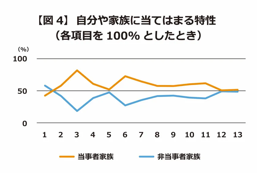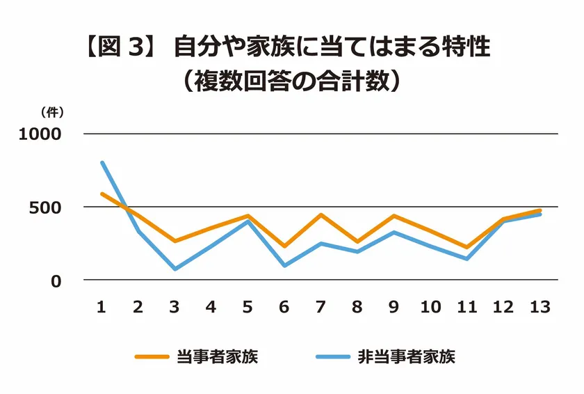 さらに、「自分や家族に当てはまる特性」を「当事者家族(本人・又は家族が当事者)」「非当事者家族(家族に当事者はいない)」に分けた結果、回答傾向が類似していることが分かった。発達障がいの有無に関わらず、同じような困りごとが身内の中にあると言える(図3)。