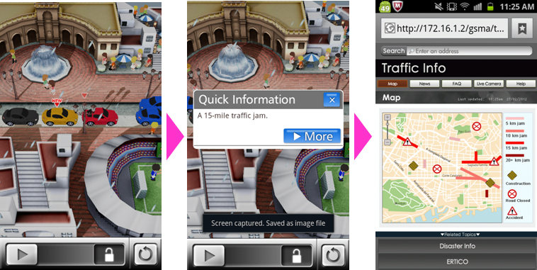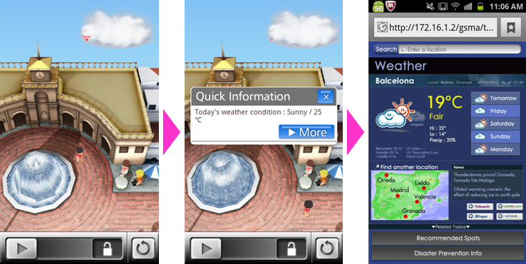 MWC2012のドコモブースでは、ヨーロッパをイメージした3Dグラフィックスの街並みに情報が提供されるデモをご覧いただけます。例えば、天気情報が街の天気として表示されたり、フラダンスをしている広場をタップするとイベント情報、掲示板のオブジェクトをタップすると新着ニュースが確認できたりなど、ユーザーが煩わしさを感じず直感的にかつ楽しく情報を取得することができます。