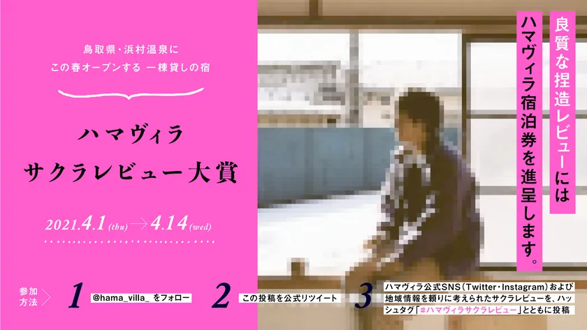 「本と音楽に耽る」一棟貸しの宿「HamaVilla(ハマヴィラ)」(所在地:鳥取県鳥取市気高町浜村、代表:宮原 翔太郎)は、2021年春のオープンを記念して2021年4月1日(木)より「まだ泊まったことのない宿」の架空レビューを投稿する「ハマヴィラサクラレビュー大賞」を開催します。