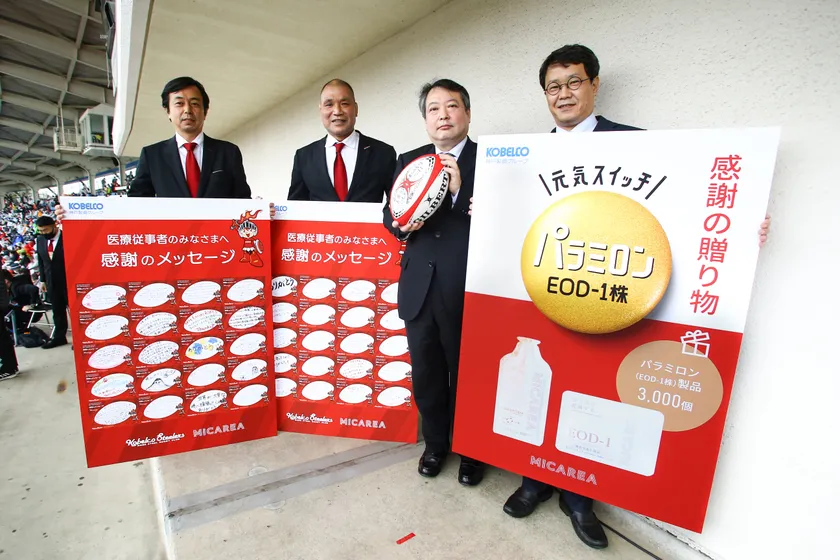 贈呈式では、神戸製鋼コベルコスティーラーズ 部長 楠山泰司・神戸製鋼コベルコスティーラーズ チームディレクター 福本正幸・株式会社ミカレア 代表取締役社長 大谷 和由より、神戸市 恩田馨副市長に、医療従事者のみなさまへの感謝のメッセージボードと、選手の直筆メッセージ入りラグビーボール、さらに疲労感軽減効果のあるミカレアの「パラミロンEOD-1」製品3,000個を贈呈いたしました。